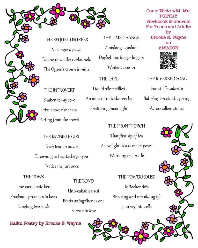 Haiku Poetry by Brooke E. Wayne Posted on September 22, 2019November 8, 2019 by Brooke E. Wayne: Romance with a Kiss of Humor Write Haiku and other forms of Poetry! AVAILABLE ON AMAZON Share this:Tweet Click to email a link to a friend (Opens in new window) Email Click to share on Reddit (Opens in new window) Reddit PocketShare on Tumblr Click to share on WhatsApp (Opens in new window) WhatsApp Click to share on Telegram (Opens in new window) Telegram Click to print (Opens in new window) Print More Published by Brooke E. Wayne: Romance with a Kiss of Humor Inspired by Love and Laughter, Romantic Comedy Author View all posts by Brooke E. Wayne: Romance with a Kiss of Humor