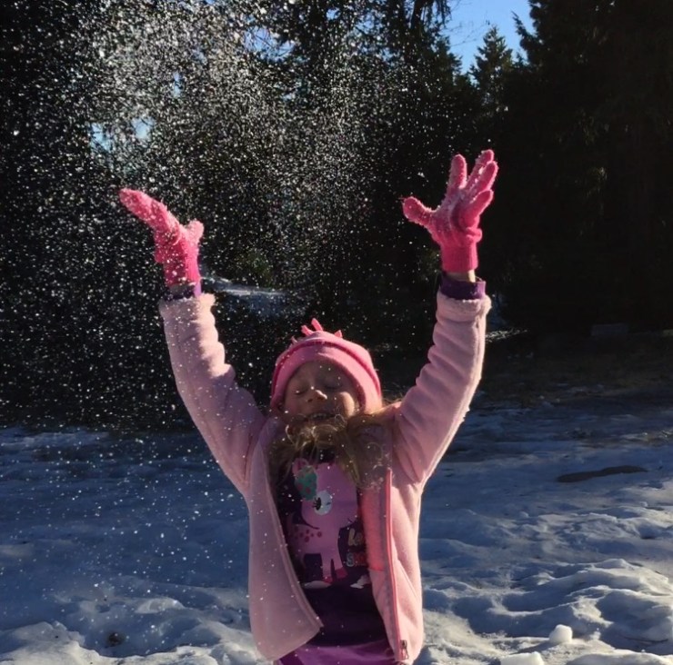I’m pretty sure it made no difference to my children, though.  As soon as they were slipping and sliding around on the illusion of snow, my seven-year-old found out the hard way that she didn’t need a sled to ride down the slope.  Then, she kept on trudging back up the slight hill and riding it back down again on her bottom, laughing all the way.  My four-year-old kicked and clawed with all her might through the crusty layer until she uncovered enough loose ice crystals she could scoop it all up and throw it over her head and pretend that it was snowing.